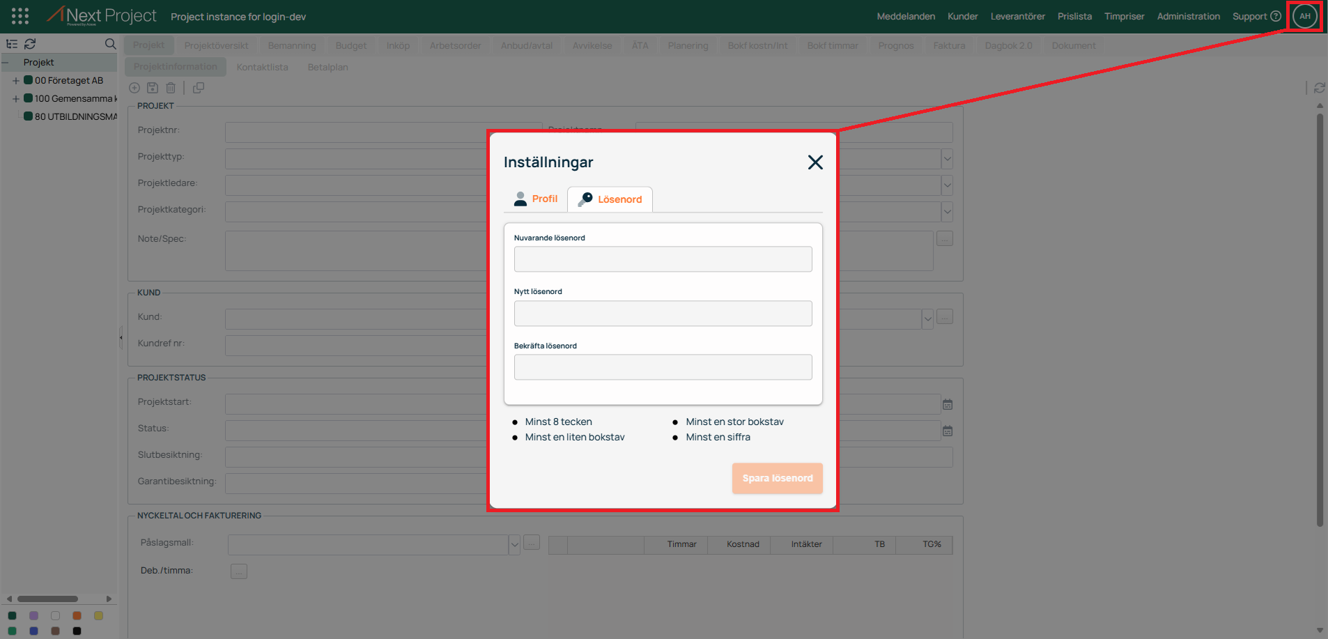 Användaren kan via "Inställningar" se info om Next Project, Profilen samt byta lösenord. Det går även härifrån att Logga ut.