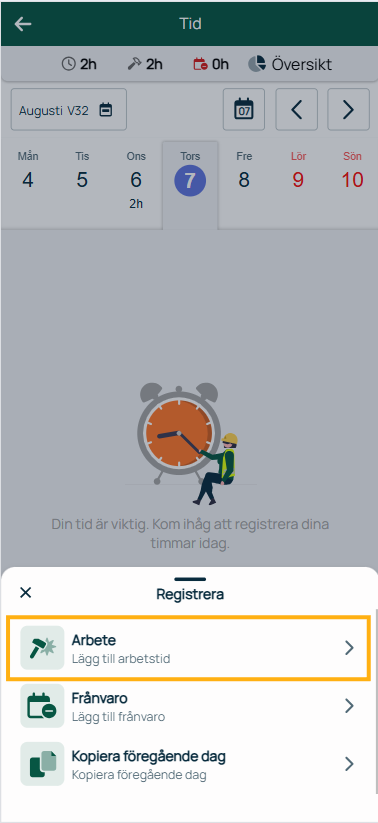 - Gå till det datum som du ska rapportera din tid på och klicka på det orangea pluset, och välj sedan Arbete.