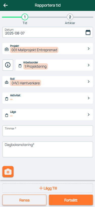Nu kommer du till delen där du, om det förväntas av dig, ska rapportera in maskiner och material som du använt under dagen. Samt eventuella lönetillägg om du har rätt till det.