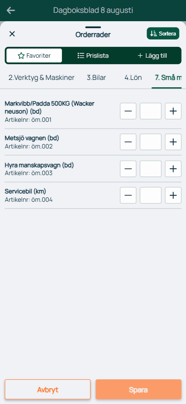 - Favoriter - Här kan du hämta artiklar från era favoritlistor genom att klicka på aktuell prislista högst upp och sedan klicka på plus- och minusknapparna för att lägga till och ta bort artiklar.