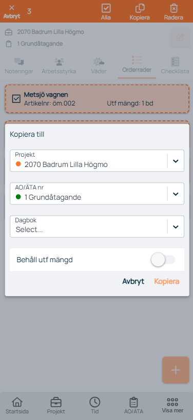 Vid kopiering kan du välja att kopiera till en annan dag, eller annat projekt/arbetsorder.