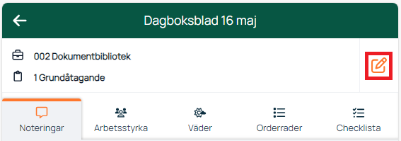 Behöver du ändra grundinformationen i dagboksbladet kan du klicka på redigeringsknappen längst upp till höger.