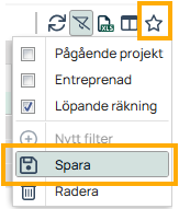 Om du jobbar mycket med filterfunktionen för att filtrera fram olika data i Next Project kan du skapa favoritfilter för att underlätta ditt jobb. För att skapa favoritfilter, följ stegen nedan: