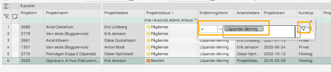 I exemplet nedan har vi sorterat fram alla projekt som har ersättningsformen ´Löpande räkning´ och har projektstatus som inte är lika med ´Admin, Anbud eller Avslutat´.