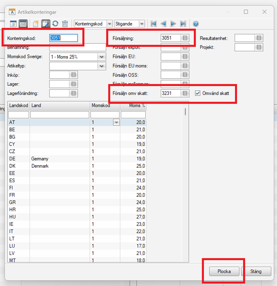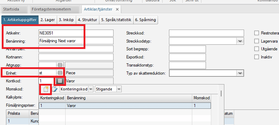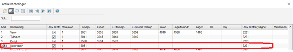 Återupprepa processen för respektive intäktskonto som används vid fakturering, exempelvis skapa en artikel med Artikelnr = 3041, benämning = Försäljning Next tjänster, enhet = st, kontokod = 3041, och ange med konto 3041 på försäljning och 3231 på Försäljning omv skatt med kryssrutan ibockad.