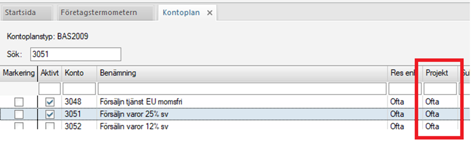 4. Om ni inte har arbetet med projektbokföring sedan tidigare, säkerställ att aktuella konton (kostnads- som intäktskonton) har inställning Ofta på Projekt under Bokföring - Kontoplan.