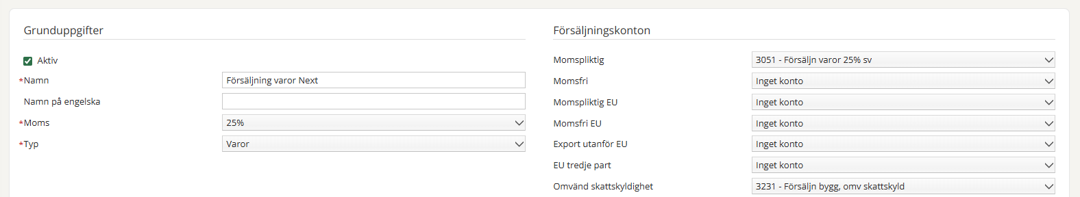 Nästa steg är att skapa artiklarna (Försäljning - Artiklar - Ny artikel). Fyll i följande fält: