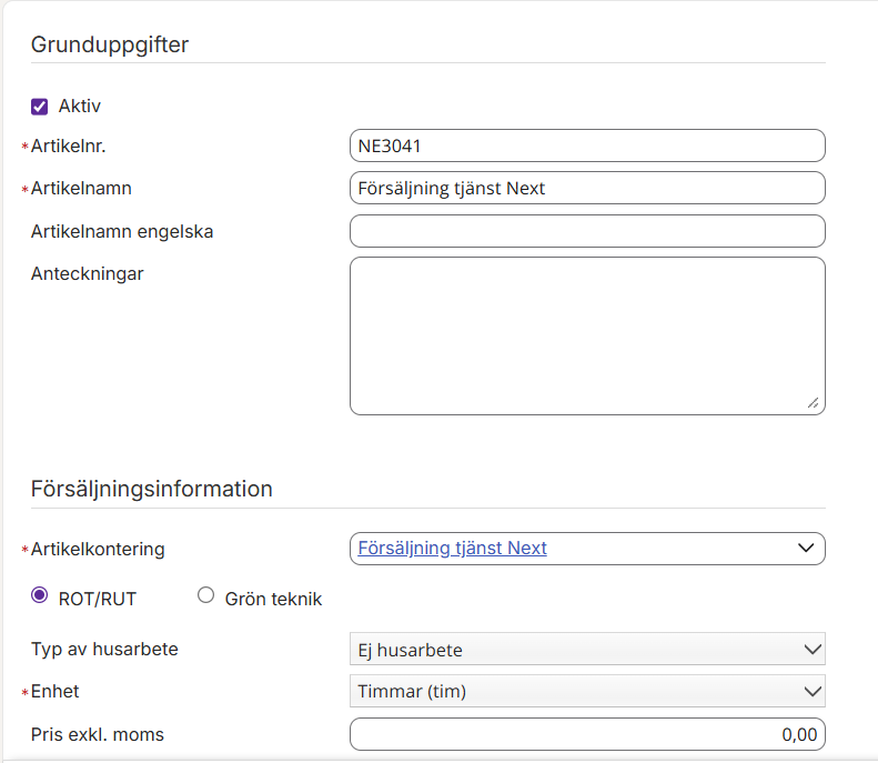 - Artikelnamn: exempelvis Försäljning tjänst Next