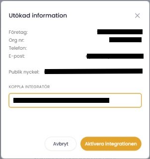 - I fältet Koppla integratör, fyll i den nyckel du har fått av din kontakt på Next Project via mail.